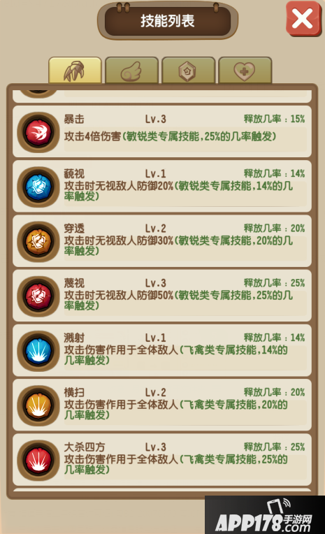 恐龙拥有的技能种类较多,分元素、攻击、回血、加成几种,具体效果游戏内的技能列表都做出详细介绍了哦!