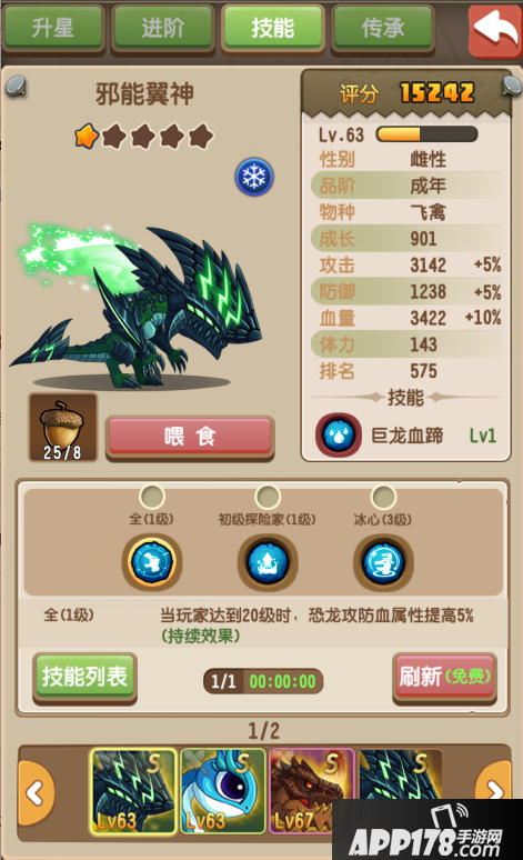 2、所有技能均已“刷新”途径获取,恐龙拥有的技能数目是根据恐龙的评级有关,例如:S级恐龙就拥有3-4种技能。