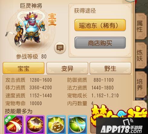 那么巨灵神将是不是很好的攻宠呢,小编觉得不是很好,因为巨灵神将本身的资质可以用差来形容,虽然有高达1600的攻资,但是体资惨不忍睹。速资不算差也不十分出彩,如此低的体资面对现在成吨的法宠,飞出场外的速度不要太快,而且作为80级宠物,缺少一个内丹格子也是硬伤。