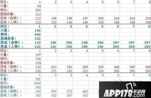 从上面的公式中,我们可以推出一个600力量点数的攻宠 当前回合首次攻击造成伤害为:基础伤害+600*0.2*目标存在回合数。也就是说附加伤害最高720,最低为0。