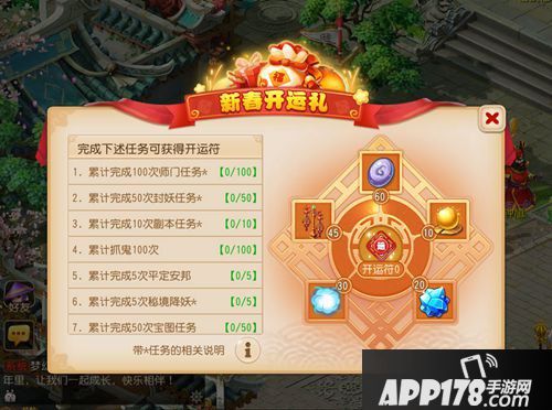 活动介绍:春节活动开启后,玩家可获得梦幻贺岁礼,其中包含新春经验礼、新春贺岁礼、新春开运礼、新年有约四重大礼。新春开运礼需要大家在大年初七起登录游戏,累计完成一定数量的日常任务,即可获取开运值解锁相应的奖励。