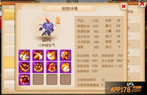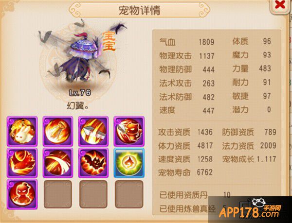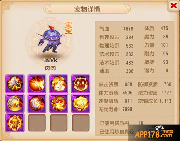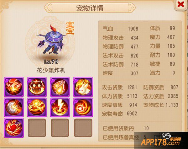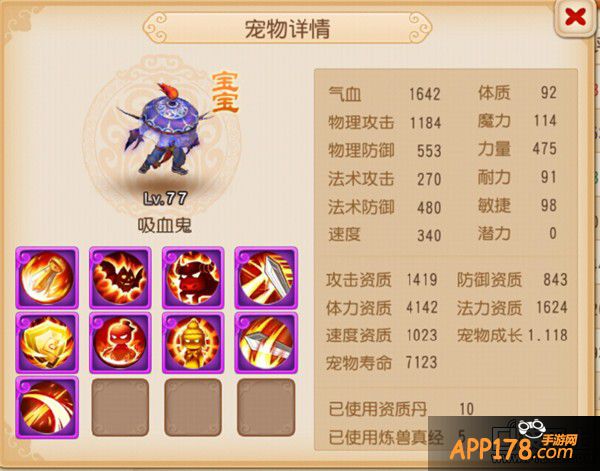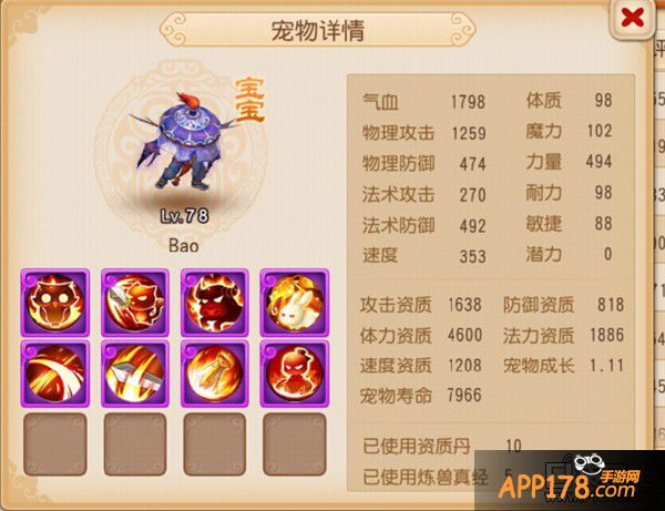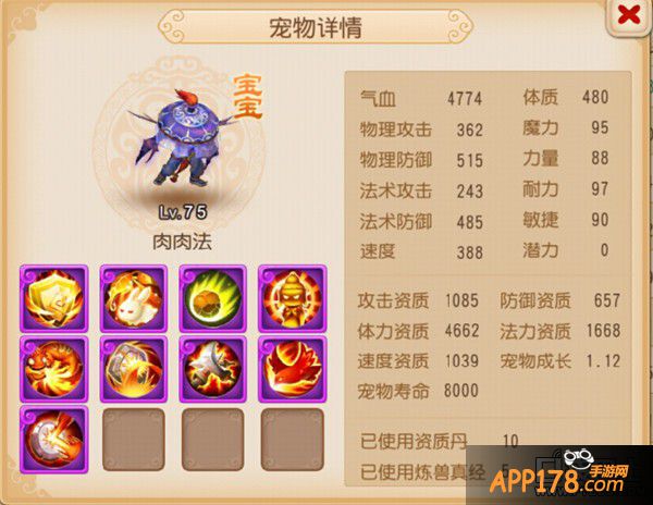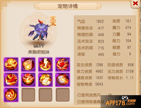 携带技能:高级法术波动、高级法术暴击、高级神佑复生、高级法术连击、高级魔之心、泰山压顶、高级固法、高级感知、高级会心。