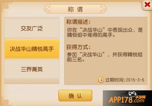 称谓描述:你在“决战华山”中表现出众,是精锐组中难得的高手。