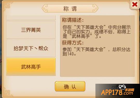 称谓描述:你在“天下英雄大会”中充分展示了自己的实力,成绩不俗,称得上是武林高手了。