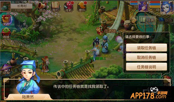 玩家可以在长寿村找NPC“陆萧然”(139,18)领取任务,要求玩家等级≥50,并且没有尚未完成的任务链即可领取。领取时需根据人物等级收取一定的金钱。任务链每周可以领取一次。