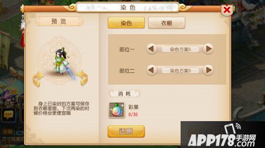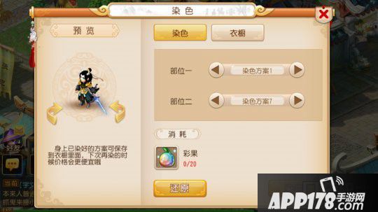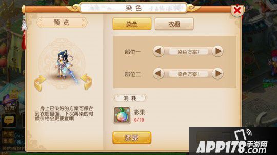 通过市场上的价格,就知道了彩果和花豆不是同一个档次的,自然而然在使用彩果染色时也特别珍惜。假如玩家只有10个彩果,没办法,只能在饰品上二选一了。小编推荐的饰品彩果颜色是“方案5”或“方案7”。其实在染饰品的时候,可以先想象日后想染什么颜色的衣服,这样才不会耽误到后面的颜色搭配。