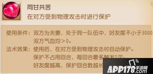 同甘共苦法术效果:使用后,在对方受到物理攻击时自动保护。保护不占用回合,每回合最多触发2次。好友度越高,保护回合数越长。