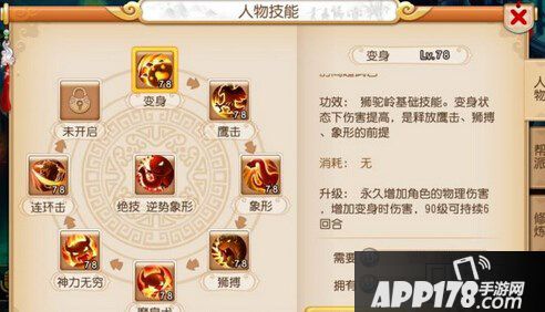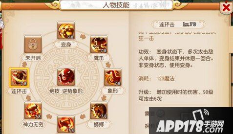 在变身状态下,多次攻击敌人单体,变身结束并休息一回合。非变身状态,使用变身。升级技能等级可以增加使用时的伤害,90级可攻击6次。