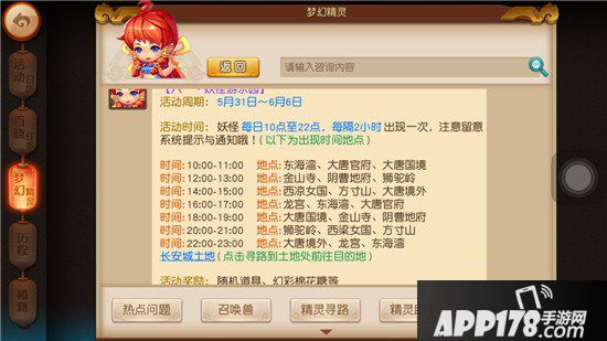 这个很简单的,每两个小时刷一回,刷一次小男孩停留一个小时。地点不固定, 每个地方都有会出现。系统一旦发通知出来,比如,东海湾,大唐官府,大唐国境。这三个地方,小男孩一定会在某个地方等你,别人是抢不到的哦,也就是说,每在小男孩出现的时候都可以去找他,帮他杀怪,然后得儿童节道具(幻彩棉花糖),运气好的话还可以得50仙玉哦(本宝宝有点丑,都是一些地板货)