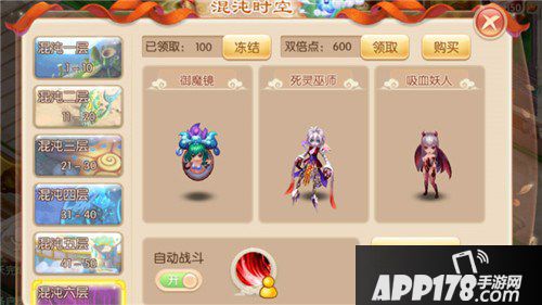 当玩家已经刷完了所有任务,但还想要获得经验;或是不想再刷活动了,只想挂一会机,那么便可以点击游戏左上角的“挂机”按钮进入“混沌时空”挂机。混沌时空是玩家挂机刷怪的重要地点,混沌时空共分为10个场景,按照难易程度分为混沌一层至混沌十层。在玩家选择挂机时,系统会默认推荐玩家至最适合玩家挂机的层数。混沌时空除了能够挂机获得经验外,也是捕捉变异宝宝,与好友增加好友度的重要方法。