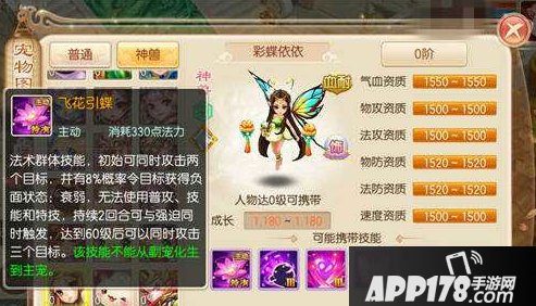 这里就不得不提它的基础属性,彩蝶依依在速度和气血方面在所有宠物是占上风的存在。速度方面和青龙相当这就可以非常快达到牵制敌方的作用。而气血上的资质比其它宠物在吸收伤害上能力强大很多,对于它的生存有很大的帮助。所以在加点上建议全血加点,这样不仅有足够的生存能力,还可以更多的给对手带来负面效果,使之不能普攻和特技。