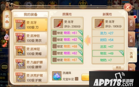 接着来聊聊洗魂,因为武器的推荐魂是攻击值(加成极多),所以大伙应认真对待。不过魂属性值与武器等级有关,考虑到收益问题个人建议当武器到达百级之后再费心打造(百级之前凑合使用),自然理想的最佳状态肯定是5橙攻击魂啦!