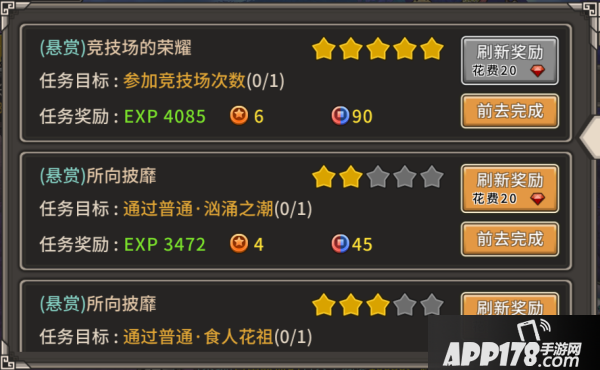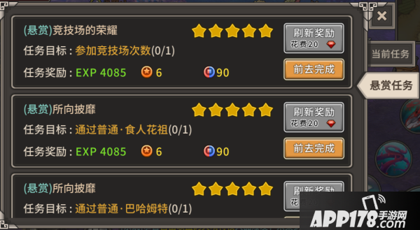 悬赏任务可以获得经验值、声望、阵营币奖励,每天有10个悬赏任务,任务大多较为简单。任务等级分为1-5星,不同星级对应的奖励也不同,1星最少,5星最多。每位玩家每天有10次免费刷新机会,后续可以用钻石进行刷新。