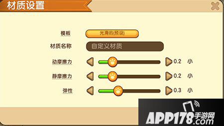 模板表示可以用之前设置好的作为参考,点击可以选择想要参考的设置参数。材质名称是给材质参数命名。动摩擦力表示移动时引起减速的摩擦力大小。静摩擦力表示要推动需要克服的摩擦力大小。弹性表示碰撞后反弹的速度。如果不记得这些设置的含义,把鼠标放在对应的名称上或者点击对应的有横线的名字,会出现相应的解释。
