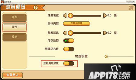 首先我们来看“物理材质”,这个选项是用来设定道具的一些物理特性的,点击大按钮: