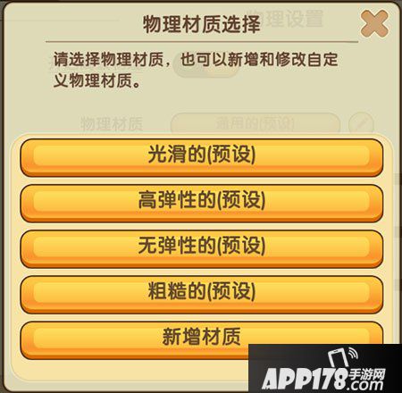 这些是已经设定好的物理特性,比如:光滑的,就是滚动的时候速度不会迅速降低;高弹性,就是被撞击以后反弹速度会比较大;无弹性,就是被撞击以后不会反弹;粗糙的,就是滚动的时候速度会快速降低。