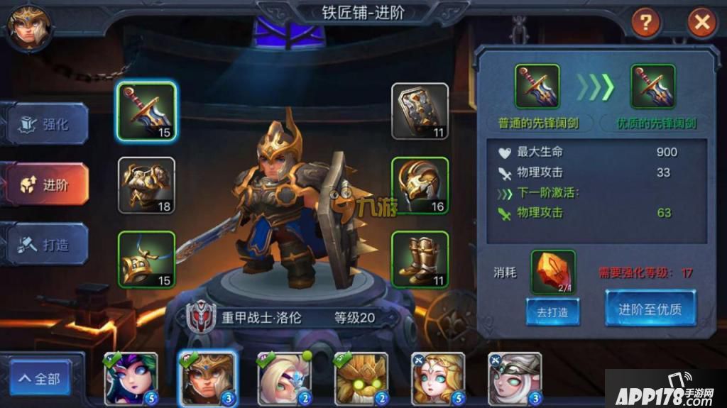 英雄装备的强化可以通过消耗一定的材料来完成。我们以洛伦为例,可以发现消耗一定数量的精铁可以强化指挥官头盔,消耗一定数量的粗磨铁可以强化先锋重甲,而消耗精石可以强化圣光誓约。伴随装备等级的强化,其功效也会增加,比如增加最大生命值、物理攻击数值,等等。