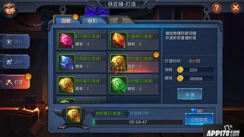 我们讲到,装备进阶需要消耗曜石。那么曜石如何获得呢?就需要我们在铁匠铺中花费一定的时间和金币进行打造。