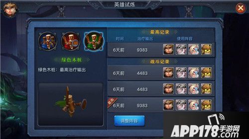 绿色木桩试炼,是用来检验治疗输出能力的。通过挑战绿色木桩,可以检测英雄的治疗输出能力。同红色木桩原理一样,每次治疗输出的数值会被记录下来,我们可以通过绿色木桩试炼来看到战队的治疗输出能力的不断提高。