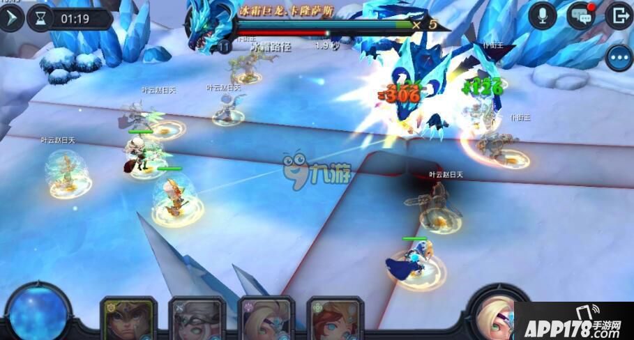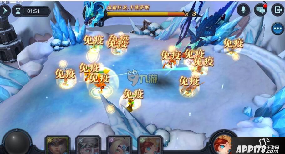 2、连环霜冻:连环霜冻,也是一个比较狠的Boss技能,被Boss盯上的英雄头顶会出现一个粉红色的箭头,并被圈住,冰龙将冰球投放在指定的英雄身上,之后会弹到周围的其他英雄身上,再回弹回来。所以当这个英雄被盯上的时候,就远远的撤离其他英雄的身边就可以