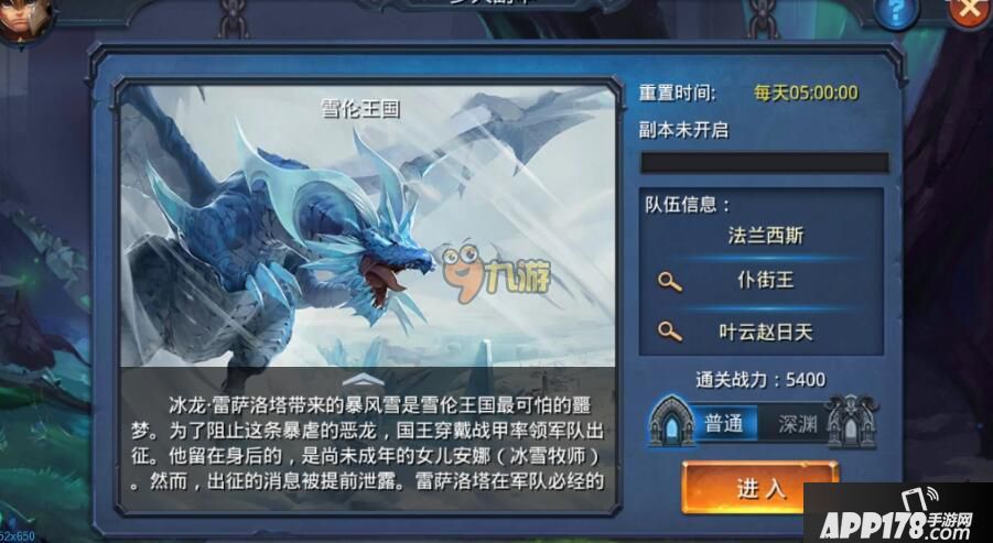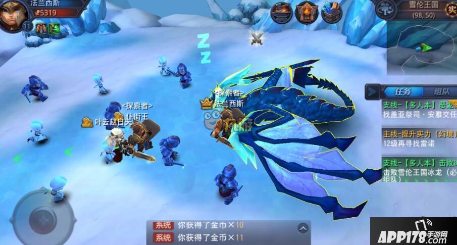在迷雾世界中有很多小伙伴在一开始进入游戏的时候可能会比较着急着去升级,其中当你的任务角色已经达到11级的时候,玩家在这期间将会遇到第一个团队副本雪伦王国,这也是很多玩家都卡住的地方,那么在这个支线任务中要怎么做呢?怎么样才能打败这个boss,接下来APP178手游小编就来和大家详细的介绍一下吧!