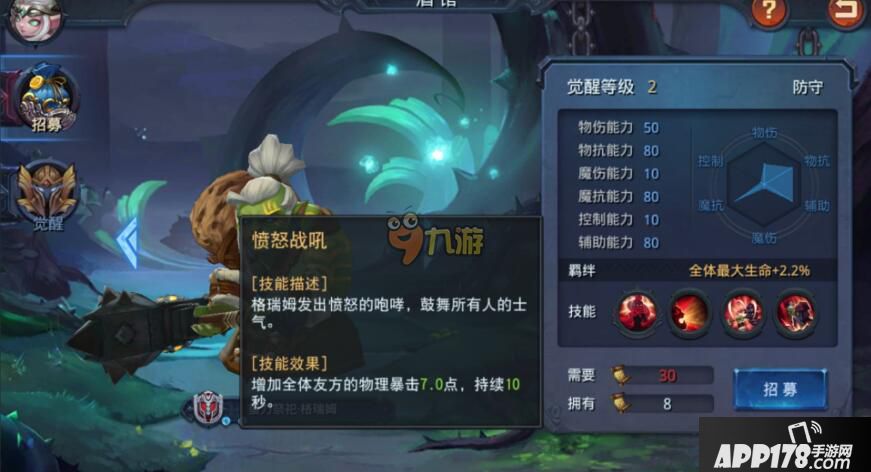 勇气战吼:格瑞姆怒吼一声,技能所有队友。