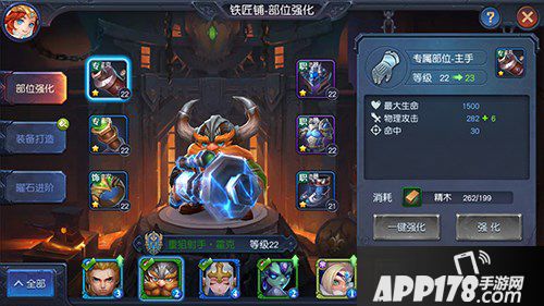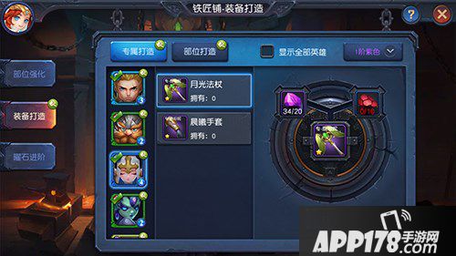在铁匠铺里有三个功能,部位强化、装备打造和耀石进阶。在选定自己要练的主要角色之后就可以把英雄的装备部位强化到跟你的等级同级。装备打造,通过消耗石头和材料能够打造新的装备。