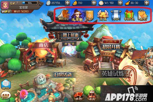 签到:右上角的签到是鼓励玩家每天登陆的一种机制,7级开启,每天按时登陆签到可以奖励各种游戏中的银两,元宝,磨刀石,英雄碎片,刷新符。签到不是连续的,中间间断了还是可以继续签到领取奖励的。