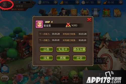 点击左上角主角人物头像,这里可以查看游戏内的公告,时刻掌握游戏最新动态,礼包领取,设置游戏声音,音效。同时遇到问题可以直接在此联系客服为你解答,社交中玩家可寻找好友,如遇到刷广告的可将其拉入黑名单。体力精力的回复时间也可以在这里查看。