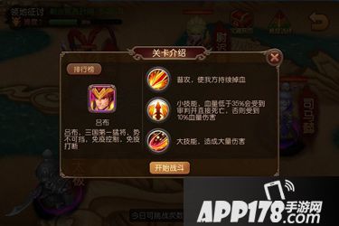 吕布和尉迟恭一样免疫控制,免疫打断,不过他不会使我方沉默,只是会让我方持续掉血,并且血量低于35%以下的话会受到审判然后直接死亡,如果血量高于35%的话,那就会受到10%血量的伤害,所以打吕布佩带的技能是:岂曰无衣,临机制胜,空元破日。其实这关重要的是保证英雄不死,所以进去后大部分能量应该放在岂曰无衣上,给英雄加血,保证英雄血量不低于35%,血量都够多的时候可放临机制胜,靠英雄打出更多的伤害。