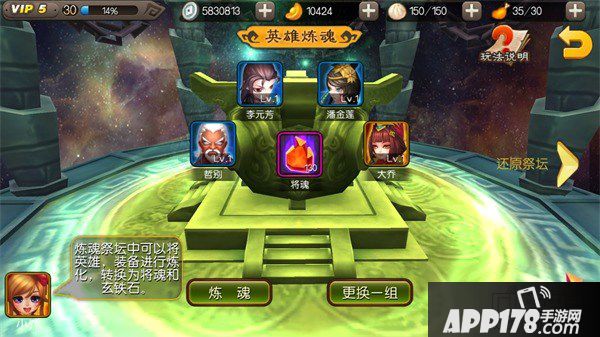 包括英雄炼魂炉和装备炼魂炉,分别可以炼化英雄和装备,将冗余的英雄和装备分别转化为将魂和玄铁石。英雄精炼炉可将未成长过的英雄炼化成将魂,根据英雄品质不同获得的将魂数量也有所不同,将魂可在将魂商店中购买物品或者英雄。装备精炼炉中可放入任意装备,该炉可将装备炼化成玄铁石并返还已成长装备消耗的成长材料。