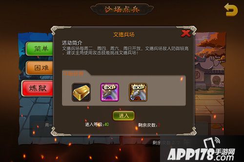 两个兵场分简单,困难,炼狱三种模式,依次可获得的经验兵书战马品级也不一样,挑战简单的可获得经验铜书铜马,困难银书银马,炼狱金书金马。不过简单主角等级10级就可挑战,困难需30级,炼狱则需40级。每天可免费挑战两次。