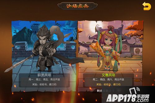 英雄试炼中的沙场点兵分昭武兵场和文德兵场,昭武兵场每周一周三周五开启,此兵场可获得经验书和磨刀石。文德兵场周二周四周六开启,可获得经验马和磨刀石。周日两个兵场全部开启。经验书可用于强化兵书,提升兵书等级增加兵书属性。经验马可用于提升战马等级增加战马属性,磨刀石是强化装备的必备材料。