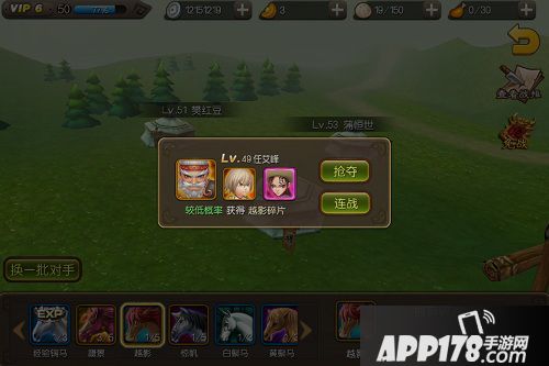 选择战马抢夺,进去之后点击下方想要搜集的战马碎片,然后在点击其他玩家的帐篷对其进行战马碎片的抢夺,抢夺战力低的玩家可使用连战,系统会自动对其进行连续抢夺,直到抢到该战马碎片才停止,但是获得碎片概率较低。连战默认次数为10次,如果抢夺战力较高的玩家,那么获得碎片概率就较高,不过需与其正面战斗并且获得胜利才行,不能使用连战。当凑齐碎片后点击合成就可获得完整的战马了。越高级的战马碎片,获得的概率越低。丙级战马和经验马所需要的碎片是3个,乙级战马所需要的碎片是5个,而甲级战马需要8个碎片才能合成。