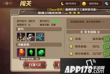 敌人的战斗力:8831,进入副本需要效果6点体力,关卡的目标与往常一样,通关副本一颗星、剩余血量达到百分之60两颗星、在两分钟里通关关卡三颗星。不是非常的难,主要玩家把握好时间就可以了。进入副本之后就会面对一大堆的怪物,二话不说上去就是干,一套技能下来,怪物也基本差不多了。