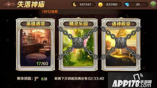玩家们先要进入失落神庙,在失落神庙中玩家们可以看到英雄酒馆、精灵乐园以及诸神殿堂等各个玩法。而英雄酒馆是直接开放的,后两个则是解锁开放。