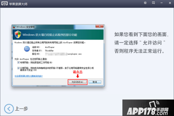首次运行 AirPlay 时会启动设置向导,按照指引进行即可。注意记得在windows防火墙警告的时候点允许访问,否则程序会无法正常运行。
