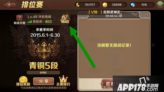 玩家们需要点进竞技场的排位赛,然后在排位赛上找到“商店”二字的图标进行点击,(如图所示)