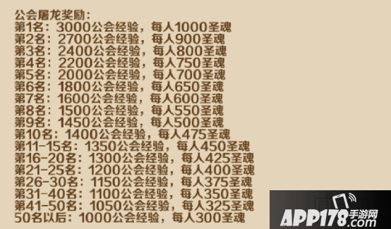 2.在屠龙活动结束之后,根据排名给参加屠龙的公会成员发放奖励,奖励大致分为金币、圣魂和宝石。参加公会屠龙的公会都将会获得公会经验奖励,这样可以让公会快速升级,公会的等级和屠龙奖励有着密切的关系,等级越高,获得的奖励就越多,大家赶紧升级自己的公会吧,下面是屠龙的奖励大家看看吧。