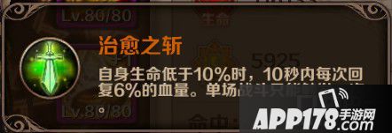 自身生命低于10%时,10秒内回复5%的血量,单场战斗只能触发一次。技能提升回血百分比每级2.5%,同套装备叠加回血百分比。
