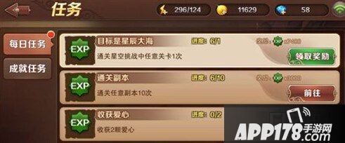 选择游戏界面的任务选项,进去后选每日任务。没错!这一选项里的大部分任务的奖励就是经验值,诸如通关副本、收获爱心、抽取宝箱等等。虽然这些任务可能在刷副本的时候就不经意间完成了,但是对于急于升级的玩家来说,把每日任务全部完成来获得经验值一定是升级必备!