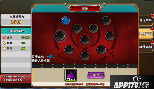 当我们升到30级时会解锁血脉功能,血脉分为三种,泰坦血脉,恶魔血脉和诸神血脉,对应属性为生命攻击防御,血脉里通过灌注可以给人物提升属性,灌注有几率暴击增长2~3格,对应的每个爱心格消耗的材料泰坦之血、恶魔之血、诸神之神也会有所增长。三种材料由恶魔巢穴随机掉落,当拥有足够材料可以灌注时,赶紧点击灌注让自己变得更强吧