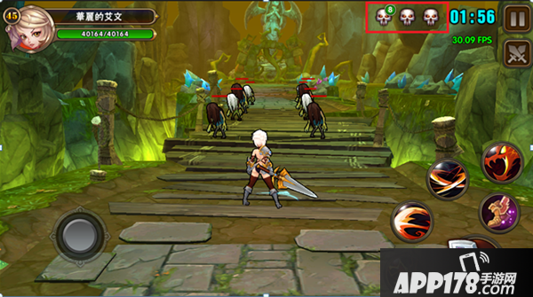 进入副本右上角的骷髅头代表战场内出场怪的波数,骷髅上的绿色数字代表怪物的数量,记住右边的时间倒计时结束时如果boss还没被击杀,那么本场挑战就失败了,还有暂停和退出战斗的按钮,失败和退出战斗不消耗挑战次数。