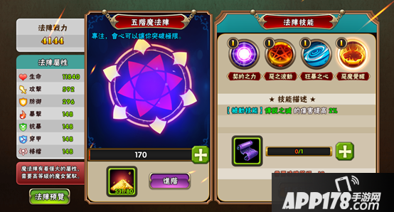打开法阵界面,就能看到一个最初级的1阶魔法阵,嗯嗯,法阵内散发出的魔力,似乎预示着它所蕴含的无穷无尽的魔法能量哦!虽说是1阶的新生法阵,但已经可以为魔女们提供相当可观的属性加成呢,所以建议各位魔女一有机会就赶紧发动法阵吧!让我们赶紧发动法阵,看看实际效果吧!
