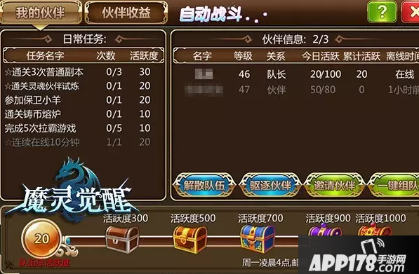 队伍周常是《魔灵觉醒》方便英雄们组队刷本开启的快捷作战模式。在这里英雄们可以组建一支常用队伍,事前大家可做好约定,能做到一呼即应地下副本做任务。这便是队伍周常的特色之处,进入《魔灵觉醒》队伍周常界面后,英雄们会看到【我的伙伴】和【伙伴收益】。