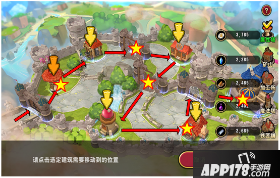 主城门→属性塔(获得1颗星)→矿山→1号城门(获得2颗星)→加工所→2号城门(获得3颗星)→魔法塔→铁匠铺(获得4颗星)→3号城门→主城(获得5颗星)