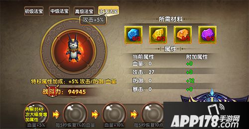 不同的法宝拥有不同的属性加成,想要获得更强的属性加成,需要通过消耗【解封石】来激活法宝的自带属性,解封石可以通过参加【四十大盗】的趣味玩法获得。