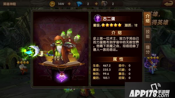 技能介绍:主动技能群攻,蓝色技能单攻(几乎必爆),紫色技能增益加自身法强