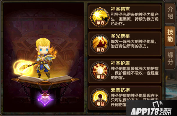 技能介绍:主动技能单疗,蓝色技能群疗,紫色技能增益反伤