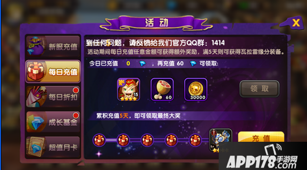 作为新开服的游戏,还有新服充值和每日充值活动,充值对应数量的钻石,能够领取相应的各种奖励。